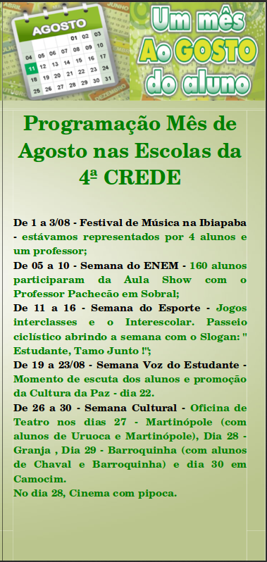 A 4ª CREDE/ Camocim em parceria com a SEDUC e as Escolas Estaduais promovem um mês especial: um mês A(o)Gosto do Aluno.