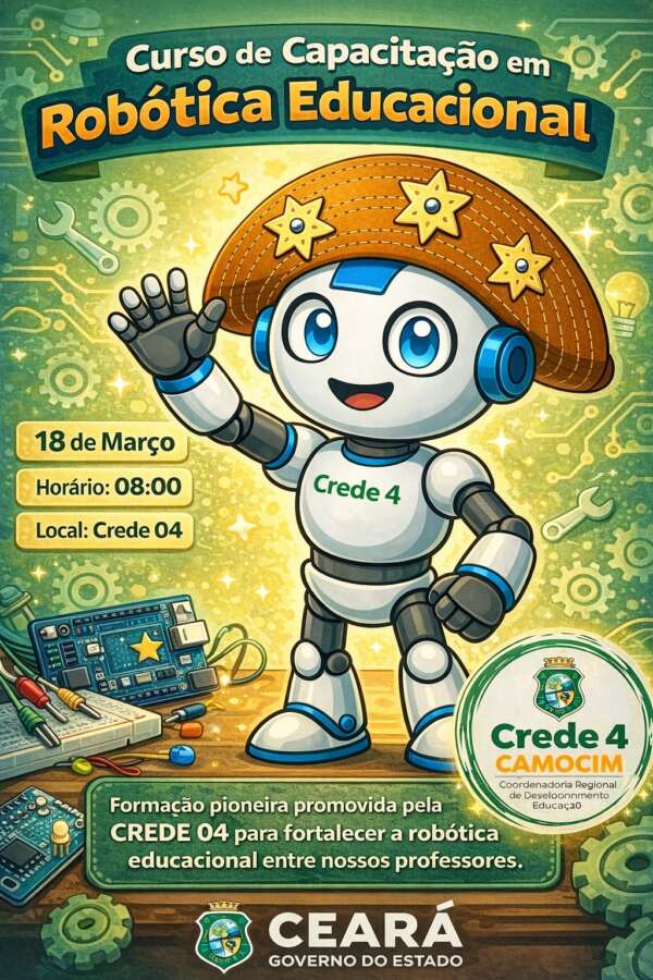No dia 18 de março, às 08h, acontece uma formação especial promovida pela CREDE 4 – Camocim, com o objetivo de fortalecer a robótica educacional entre nossos professores e incentivar a inovação nas escolas.